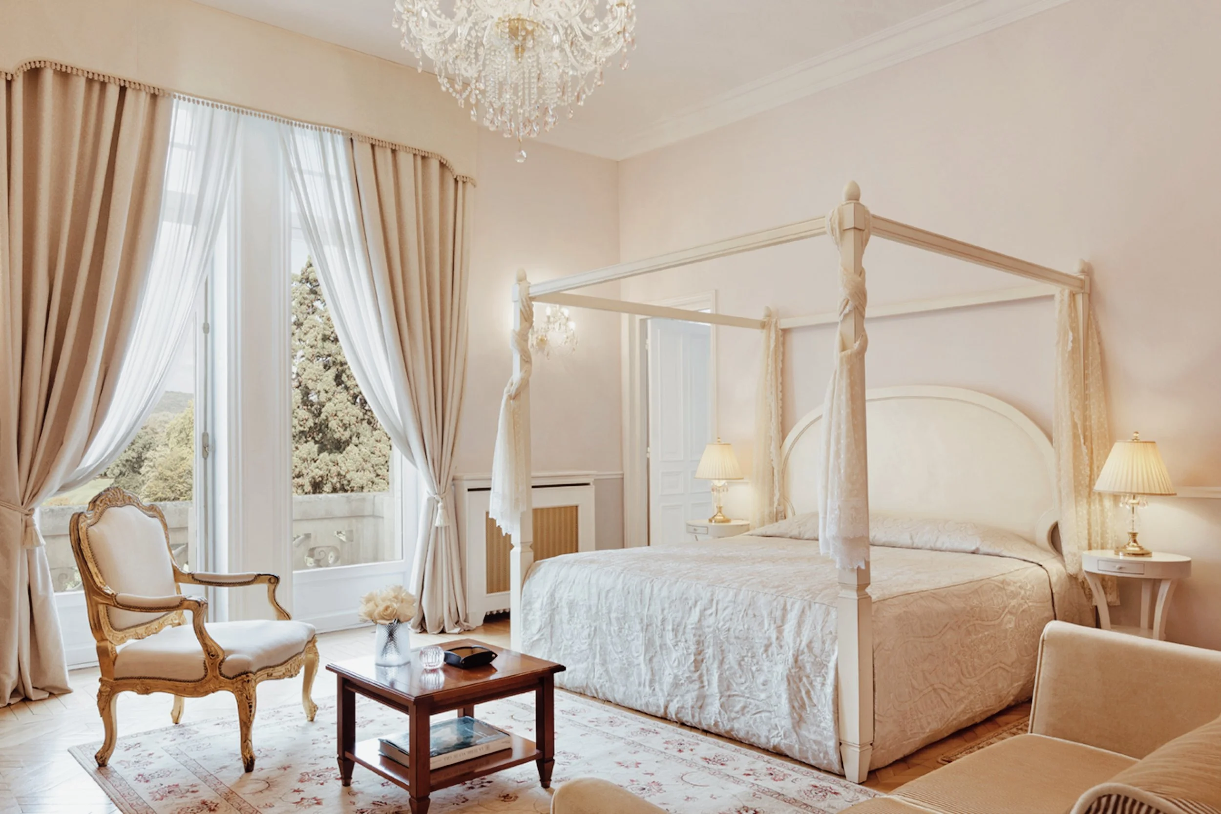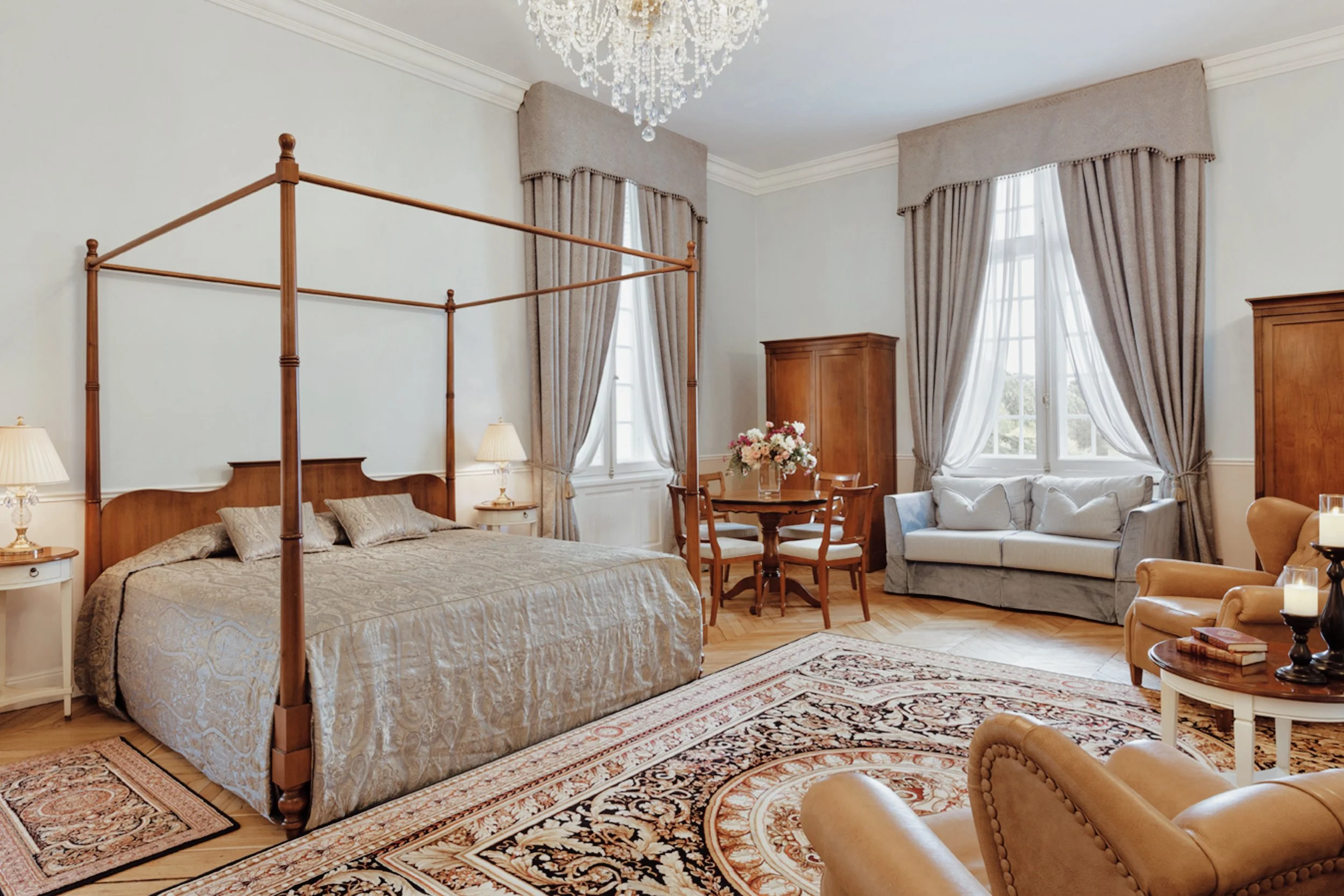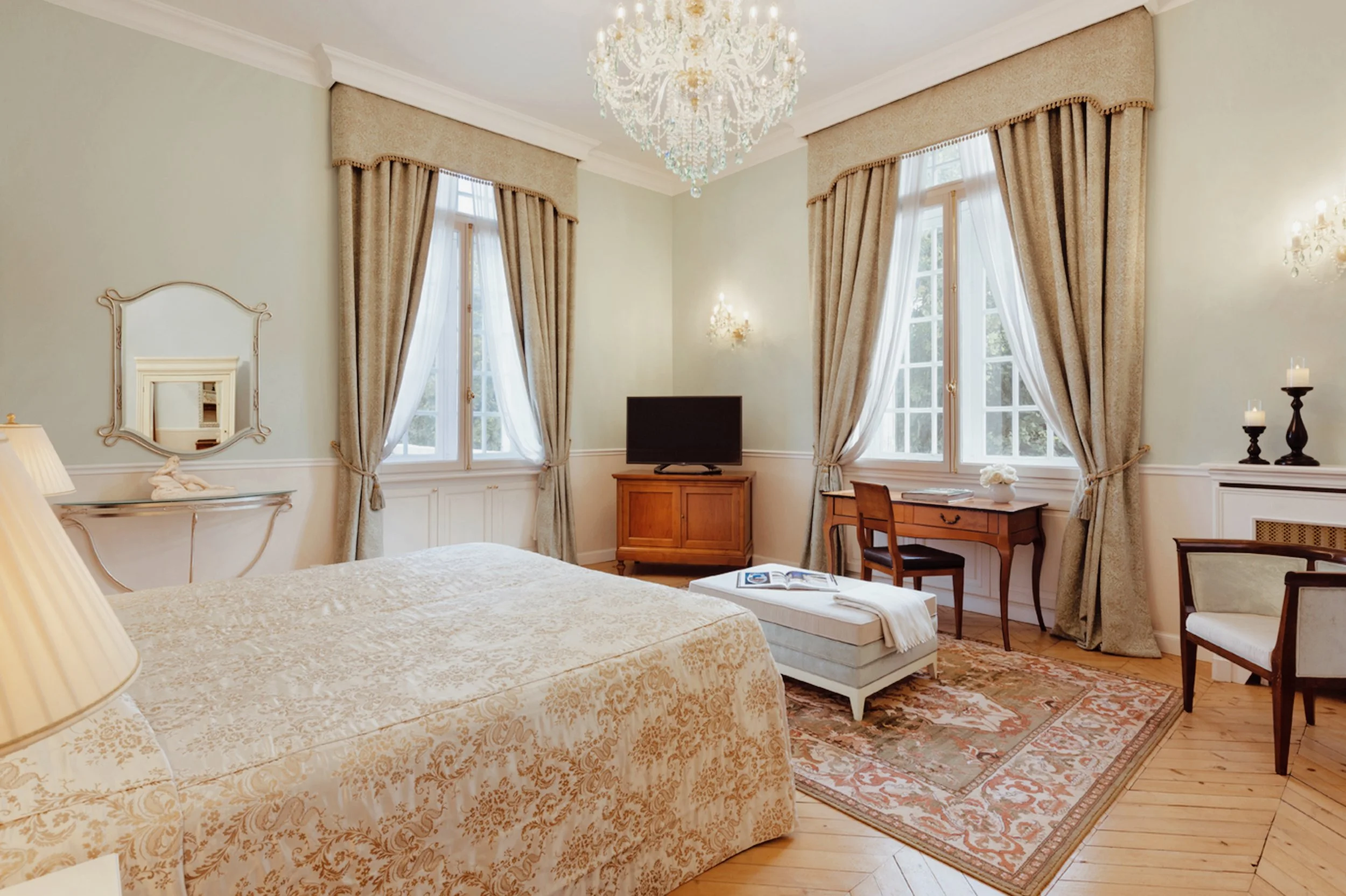 Some suites open onto private terraces with views of the Horse Club or the chateau gardens. Others offer walk-in dressing rooms or sweeping central vistas.